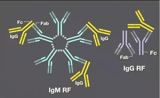 最經(jīng)典的例子是 1940 年代Waaler在某些RA患者血清中發(fā)現(xiàn)類(lèi)風(fēng)濕因子 (rheumatoid factors, RF)。在1958年RF血清中呈陽(yáng)性被美國(guó)風(fēng)濕病學(xué)會(huì)納入類(lèi)風(fēng)濕性關(guān)節(jié)炎確診標(biāo)準(zhǔn)里,一起被列入確診標(biāo)準(zhǔn)的還有“晨僵”“關(guān)節(jié)活動(dòng)痛苦或壓痛”“對(duì)稱(chēng)性關(guān)節(jié)腫脹”“皮下結(jié)節(jié)”“受累關(guān)節(jié)X線片改變”等。但很多沒(méi)有 RA 的人也有 RF 陽(yáng)性。