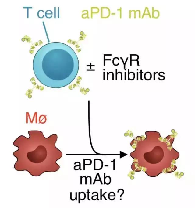 隨后研究人員利用以流式細胞計監(jiān)測的抗體轉(zhuǎn)移實驗證明了這一發(fā)現(xiàn)。T細胞首先與染色后的PD-1抗體共培養(yǎng)30分鐘,后與巨噬細胞一起培養(yǎng),最后用流式細胞計分析,大量PD-1抗體在巨噬細胞內(nèi)被測出。然而,在實驗開始時加入Fcγ受體抑制劑那么PD-1抗體就不會從T細胞轉(zhuǎn)移到巨噬細胞。之后研究人員利用酶偶聯(lián)免疫吸收劑實驗發(fā)現(xiàn),巨噬細胞與T細胞以及與鼠PD-1抗體同源的IgG2a抗體共培養(yǎng),同樣IgG2a抗體被巨噬細胞降解。