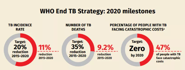 2014年和2015年世界衛(wèi)生組織和聯(lián)合國(guó)提出可持續(xù)發(fā)展目標(biāo),希望2035年能夠終止結(jié)核病的流行,2020是作為里程碑的一年,結(jié)核防治結(jié)果卻遠(yuǎn)遠(yuǎn)未達(dá)到預(yù)期。與2015年相比,2020年結(jié)核病發(fā)病率目標(biāo)是降低20%,目前只降低了11%;結(jié)核病的死亡人數(shù)是降低35%,目前只降低了9.2%;由于結(jié)核病治療導(dǎo)致家庭經(jīng)濟(jì)面對(duì)巨大困難的百分比降至0%,目前只達(dá)到47%。