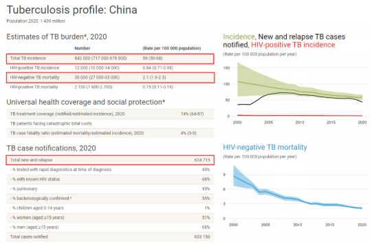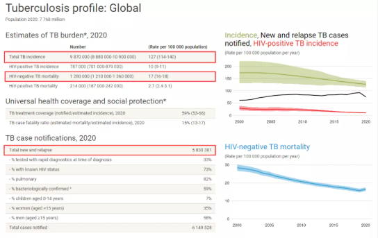 從數(shù)據(jù)來(lái)看,2020年,WHO預(yù)估全球結(jié)核病新發(fā)病例為987萬(wàn)(發(fā)病率為127/10萬(wàn)),因結(jié)核病死亡(艾滋病陰性患者)的人數(shù)為128萬(wàn)(死亡率為17/10)。