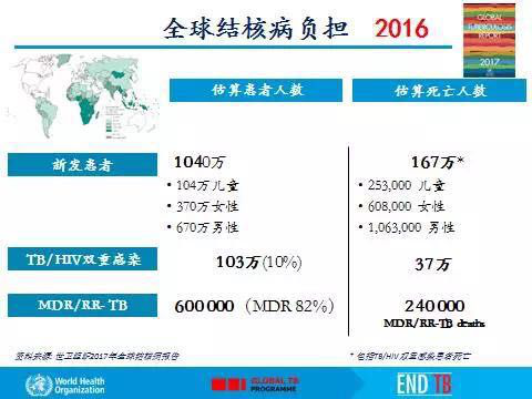 (1)2016年,1040萬(wàn)人患有結(jié)核病,170萬(wàn)人因該病死亡(包括40萬(wàn)艾滋病毒感染者)。超過(guò)95%的結(jié)核病死亡發(fā)生在低收入和中等收入國(guó)家。