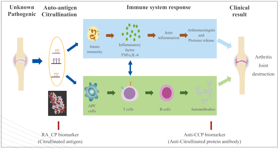 從2000年以來(lái),除了國(guó)際公認(rèn)的RA診斷指南中CCP外,一直未有突破性的高靈敏指標(biāo)。我公司研發(fā)出最具潛力的RA血清學(xué)診斷新指標(biāo)——RA_CP(類(lèi)風(fēng)濕關(guān)節(jié)炎瓜氨酸化蛋白檢測(cè)試劑盒),采用雙抗體夾心法測(cè)定人血清中瓜氨酸化類(lèi)風(fēng)濕抗原,這是根據(jù)抗原-抗體的出現(xiàn)時(shí)間先后,疾病發(fā)生原理設(shè)計(jì)和臨床大量樣本驗(yàn)證了的一個(gè)檢測(cè)類(lèi)風(fēng)濕關(guān)節(jié)炎疾病的新指標(biāo)。RA_CP對(duì)RA的檢測(cè)靈敏度85%-95%,特異性85%-95%,對(duì)于常規(guī)CCP檢測(cè)陰性的RA患者,RA_CP仍可檢出40%-50%(截至目前的數(shù)據(jù)是超過(guò)50%)。在CCP陰性患者中使用RA_CP可提高RA患者檢出率,提高臨床診斷類(lèi)風(fēng)濕性關(guān)節(jié)炎的準(zhǔn)確性,顯著降低臨床漏診發(fā)生率,開(kāi)展RA_CP檢測(cè)項(xiàng)目在臨床上可以更好地輔助RA診斷。